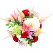 Experience the warmth and brilliance of our breathtaking bouquet featuring a delightful fusion of vibrant hues and exquisite textures. This luxurious arrangement is masterfully composed with red roses, pink lilies, elegant white hydrangeas, charming pink astible, fresh green celosia, and delicate phlox. Every flower is carefully hand-selected to ensure unmatched quality and freshness, making this a truly unique expression of sentiment.