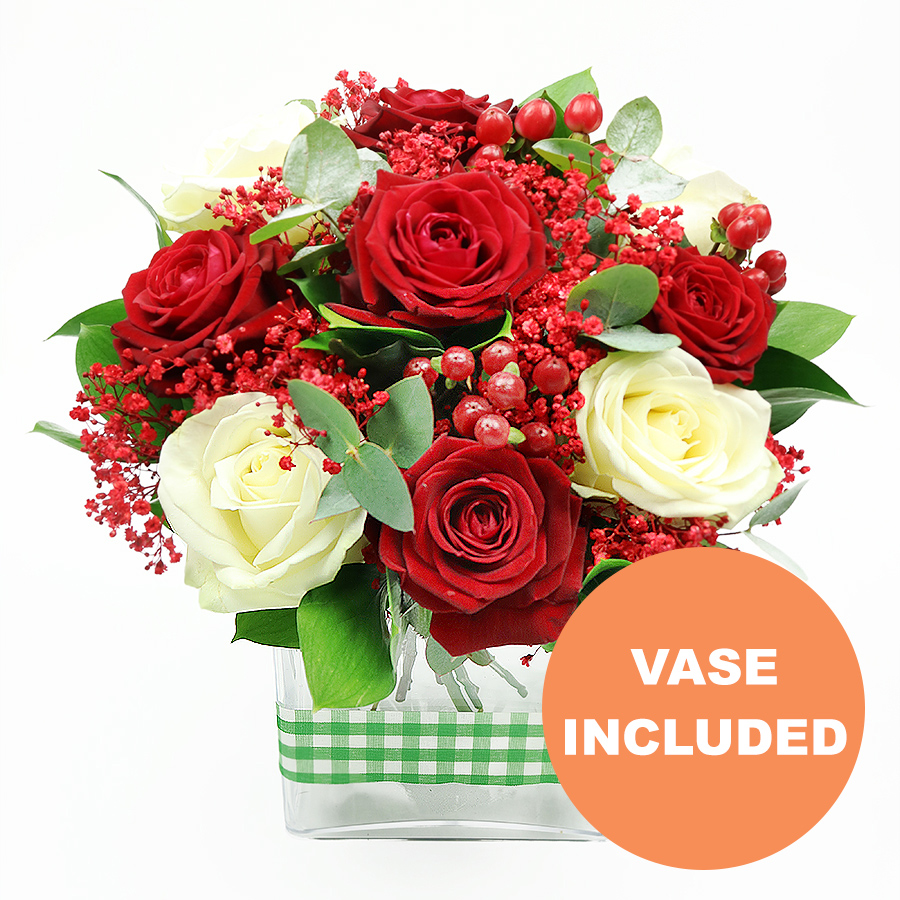 Celebrate romance with our QUEEN OF HEARTS rose bouquet from Charing Cross Florist in Charing Cross. This enchanting arrangement blends classic red and pure white roses with rich red hypericum, red gypsophila and fresh greenery for a luxurious, premium finish. Perfect for Valentine's Day, anniversaries or any romantic occasion, these roses are delivered in bud so you can enjoy watching them open and last longer in your home. A stylish vase is included for maximum display impact, making it an effortless gift that's ready to enjoy straight from the box. Every QUEEN OF HEARTS bouquet comes with a 5-day freshness guarantee, so you can send with confidence. Our expert florists carefully select and arrange each stem, using seasonal substitutions only when necessary and always matching the style, colour and value. Guard petals are left on the roses to protect the inner blooms during transit and can be gently removed on arrival for a flawless look. With reliable next day flower delivery across the UK on orders placed before 4pm, it's easy to surprise someone special with this romantic rose arrangement. Brighten their day with luxury blooms from Charing Cross Florist - order your QUEEN OF HEARTS bouquet online today.